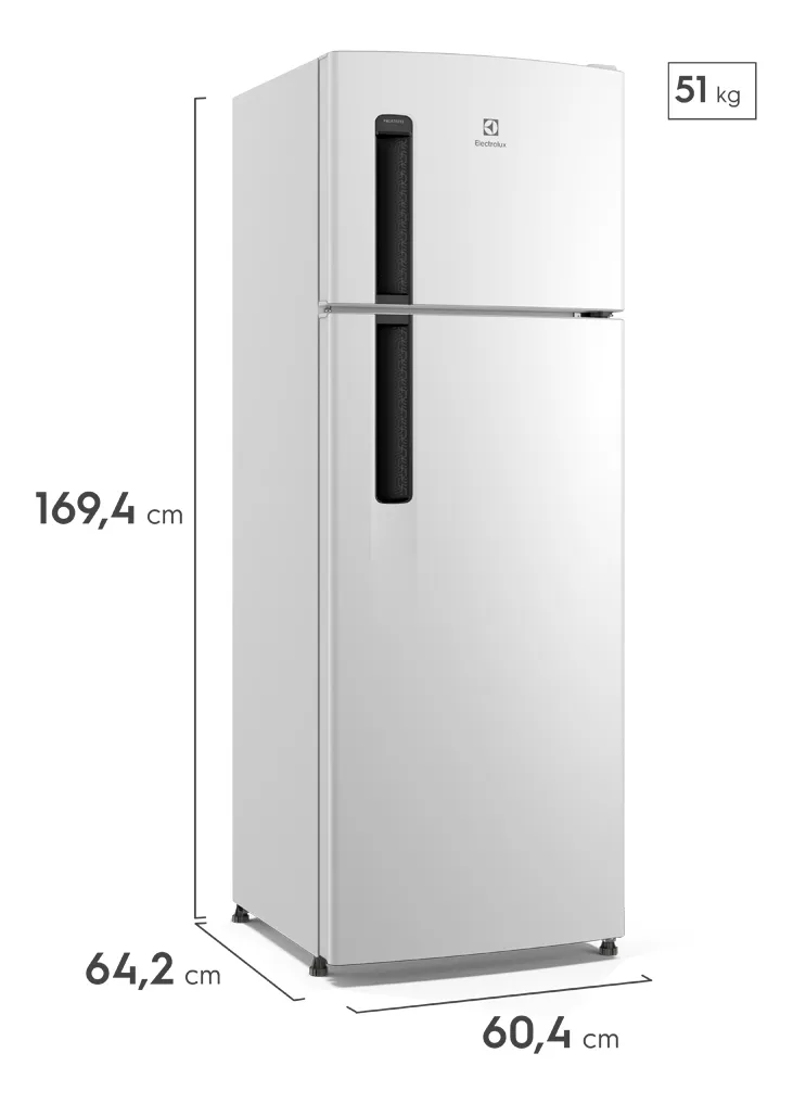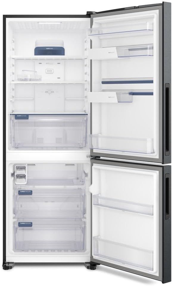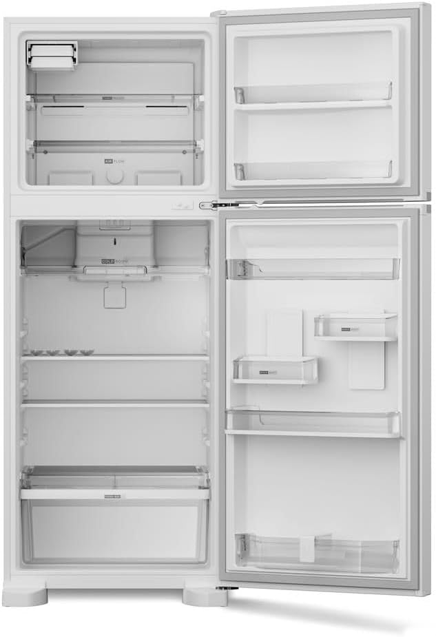 - Tipo: Frost Free Duplex, freezer em cima, refrigerador embaixo, sem necessidade de descongelamento manual graças ao sistema frost free.